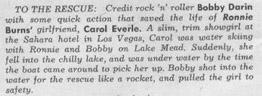 girlfriend, Carol Everle. A slim, trim showgirl at the Sahara hotel in Las Vegas, Carol was water skiing with Ronnie and Bobby on Lake Mead. Suddenly, she fell into the chilly lake, and was under water by