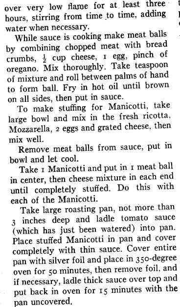 Mozzarella, 2 eggs and grated cheese, then mix well. Remove meat balls from sauce, put in bowl and let cool. Take 1 Manicotti and put in 1 meatball in center, then cheese mixture in each end until completely stuffed. Do this with each of the Manicotti. Take large roasting pan, not more than 3 inches deep and ladle tomato sauce (which has just been watered) into pan. Place stuffed Manicotti in pan and cover completely with thin sauce. Cover entire pan with silver foil and place in 350-degree oven for 50 minutes, then remove foil, and if necessary, ladle thick sauce over top and put back in oven for 15 minutes with the pan uncovered.