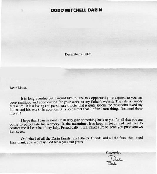 I am deeply grateful to Dodd Darin for this letter and his approval of the site. Here is the wonderful letter I received from him. Words cannot fully express my gratitude for his warm sincerity and kindness. Thank you so much, Dodd.