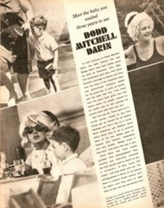At last -- pictures of Dodd Mitchell Darin, the baby Sandra Dee and Bobby Darin has kept hidden since his birth on December 16, 1961. The excitement back then, first about Sandra's marriage to Bobby and then over the news of the expected baby, was phenomenal. Everyone waited for the great day. It came, of course, and the baby was fine. Then there were the usual facts given out -- the baby's name, his weight, reports on his health and how pleased his parents were with their new son.