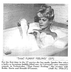 That Funny Feeling (1965)![]() ![]() After a 18 month absence from the screen, Bobby Darin's ninth movie That Funny Feeling premiered in August of 1965. Although the critics put it down, it was a good vehicle for Bobby and Sandra and it was their last movie together. One particularly funny part of the film was Bobby being stuck out on a busy city street in a womans skirt. Sandra often joked that Bobby had better legs than she did. ![]() The plot was a little crazy, but Bobby and Sandra still had the chemistry on screen. Bobby sang the theme song "That Funny Feeling" which was released as single on Capitol records and on the Capitol LP The Best of Bobby Darin in 1965. It is now available on the Capitol Collectors Series CD. ![]() Donald O'Connor and Nina Talbot also starred in That Funny Feeling. ![]() bobbydarin.net, All Rights Reserved. |